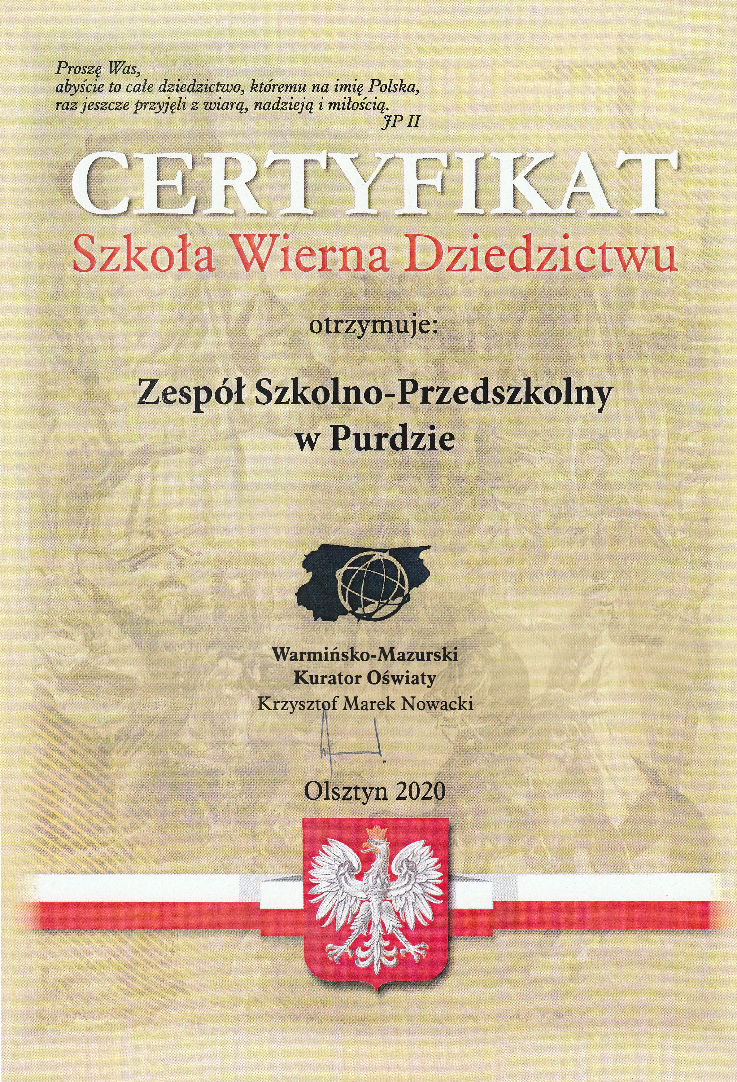 Certyfikat Szkoła Wierna Dziedzictwu