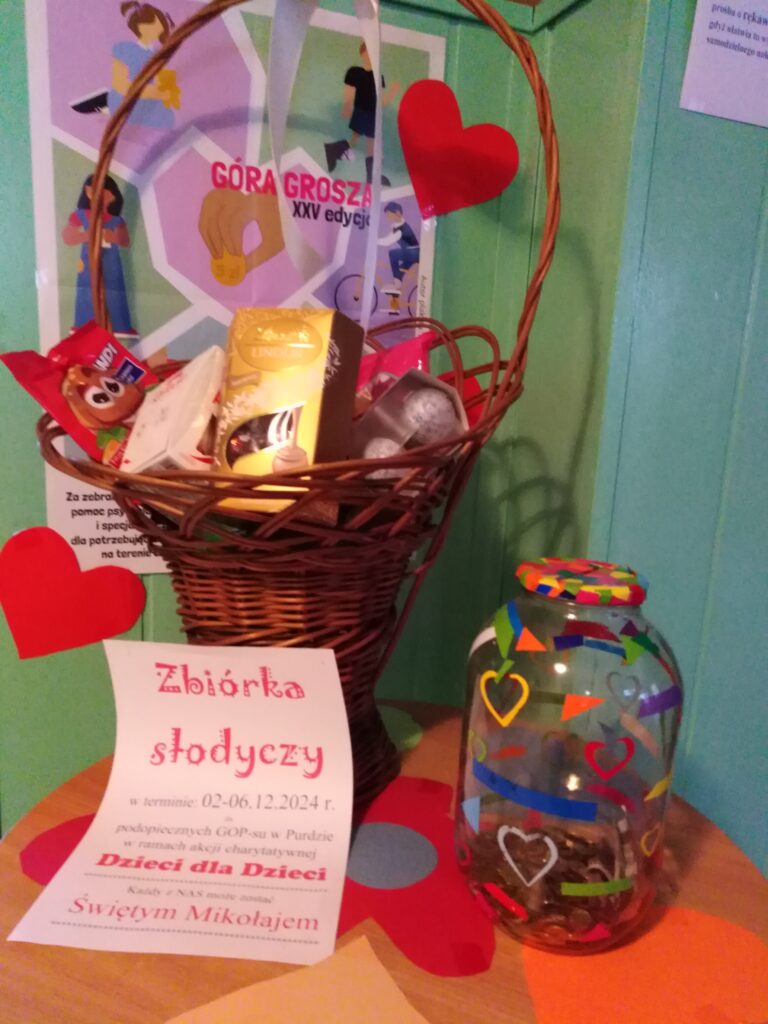 W grudniu zbieraliśmy słodycze dla podopiecznych GOPS-u w Purdzie. Każdy mógł zostać Świętym Mikołajem i podarować dzieciom uśmiech na twarzy oraz radość i nadzieję na zbliżające się Święta Bożego Narodzenia.