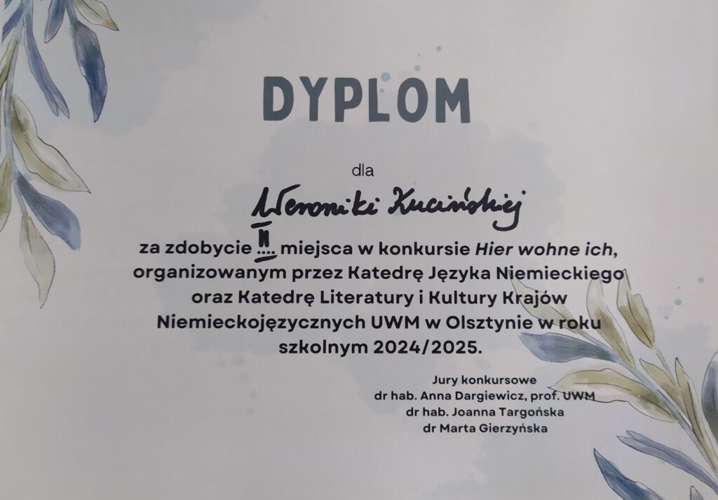 Trudu wykonania pracy konkursowej podjęła się uczennica naszej szkoły Weronika Kucińska. Jej piękna prezentacja multimedialna została doceniona przez jury konkursu i nagrodzona II miejscem. Weronika otrzymała dyplom i nagrodę oraz uczestniczyła w interesujących warsztatach językowych. Serdecznie gratulujemy Weronice osiągniętego sukcesu!